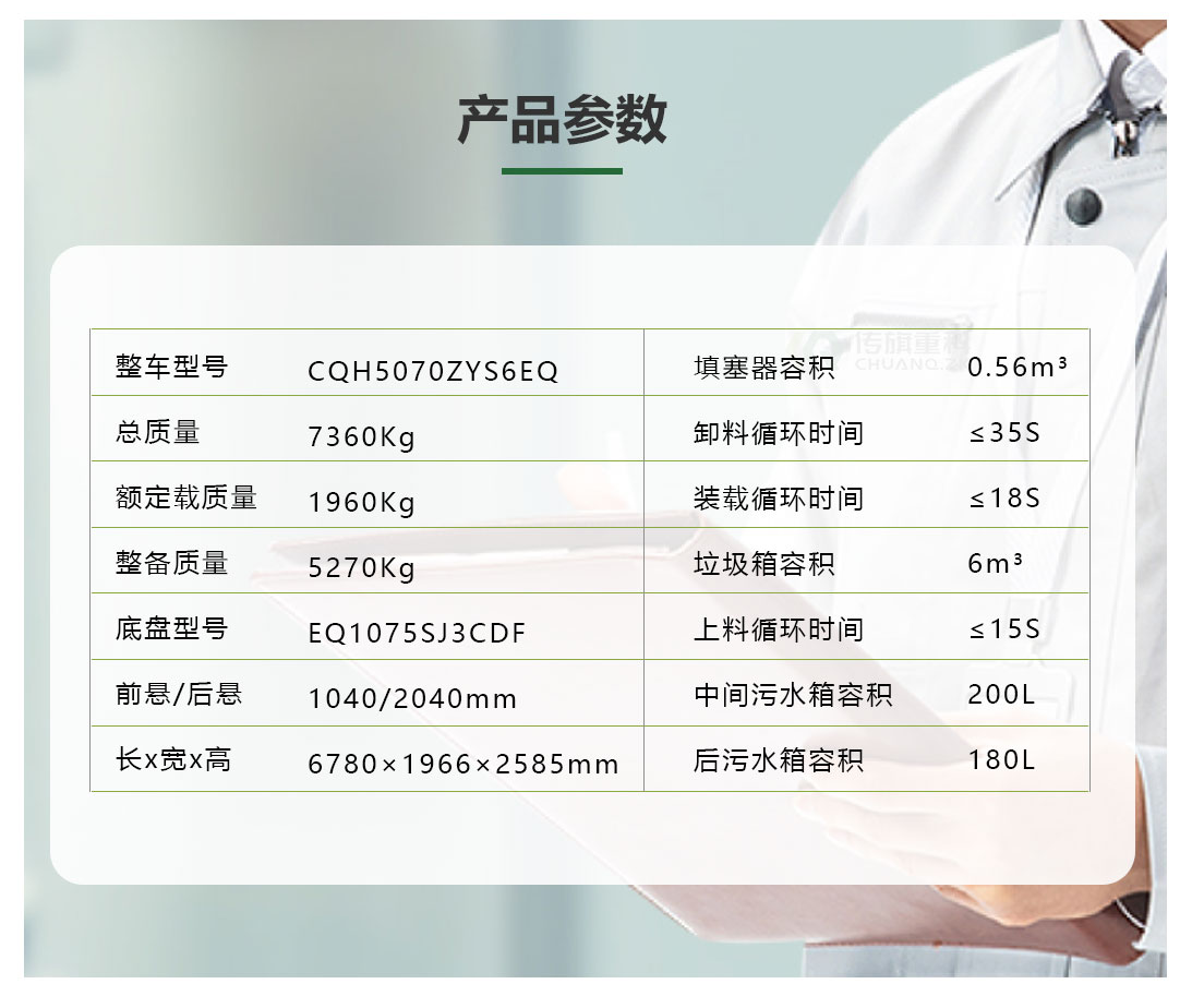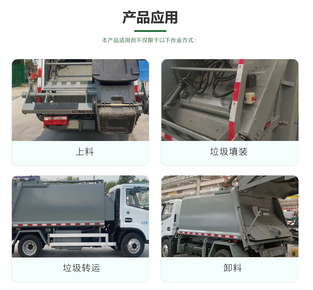 本产品是我公司自主开发、设计的新一代后装压缩式垃圾车。主要适用于收集、压缩、运输城镇居民区、社区、大型厂矿、机关院校和狭窄街道老城区的桶装、袋装和散装生活垃圾,适应不同用户收集垃圾方式的需求。