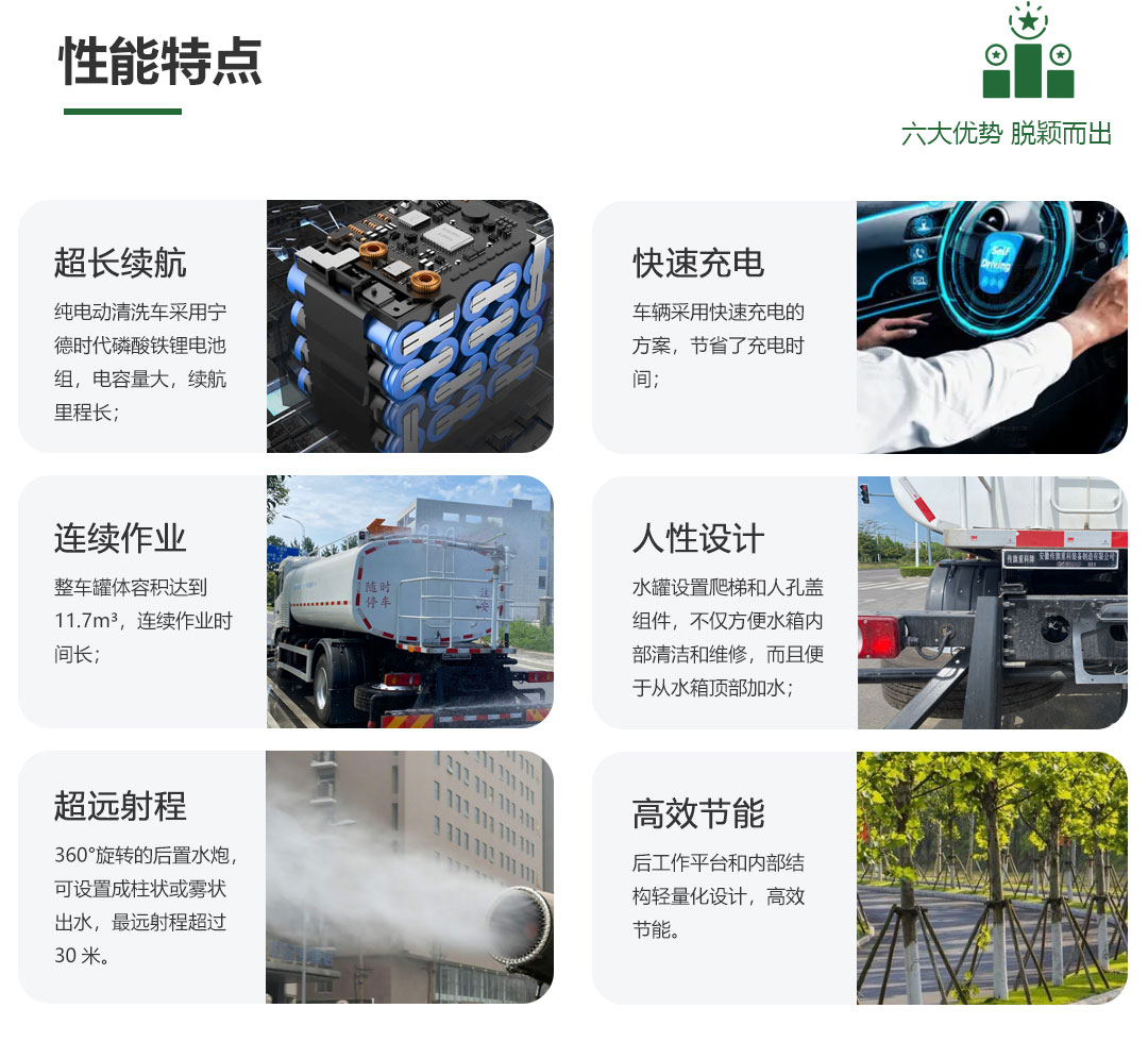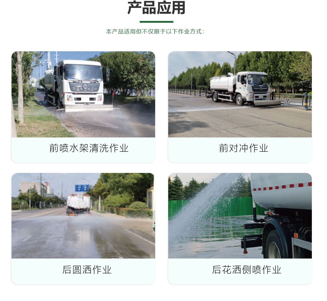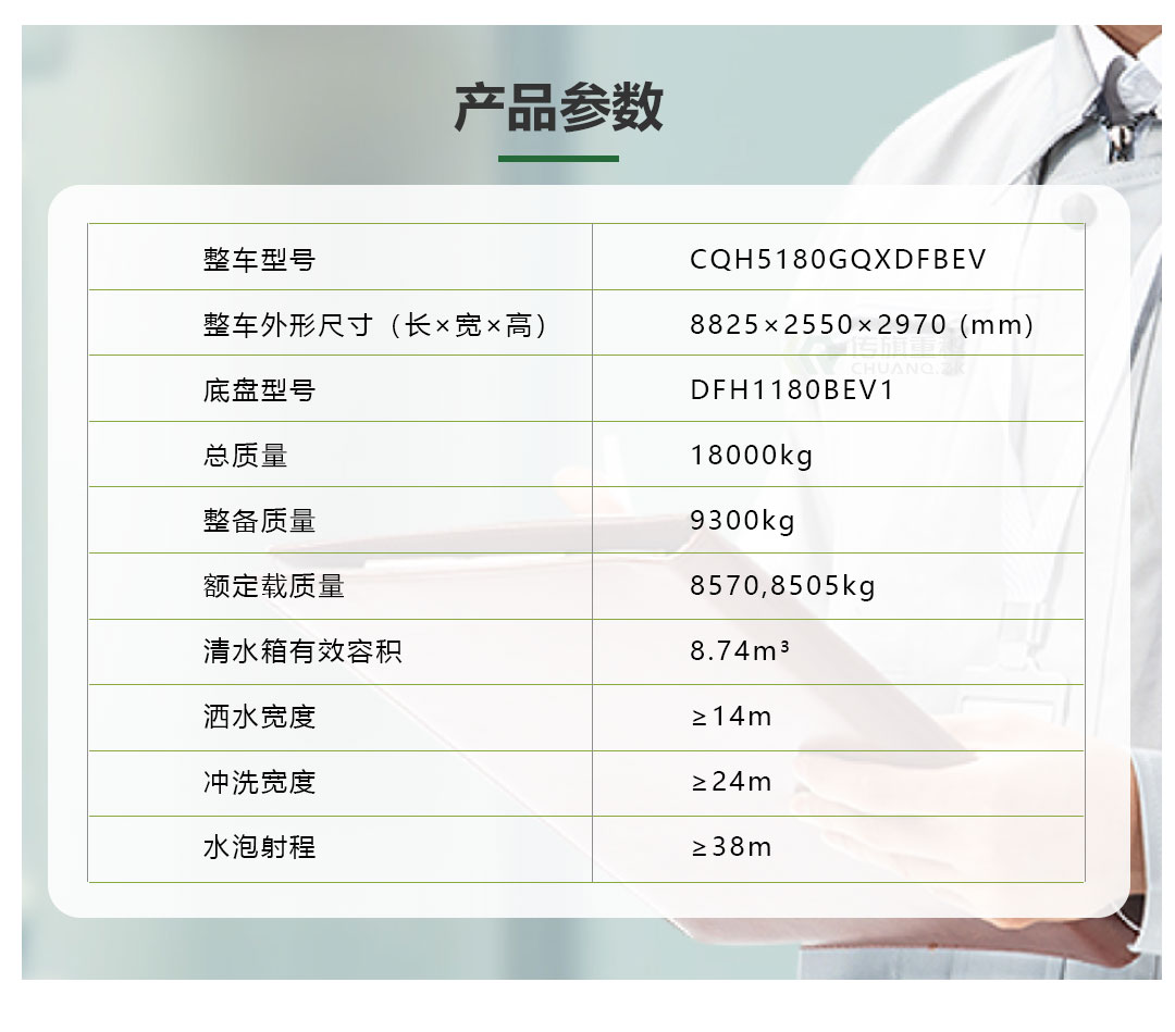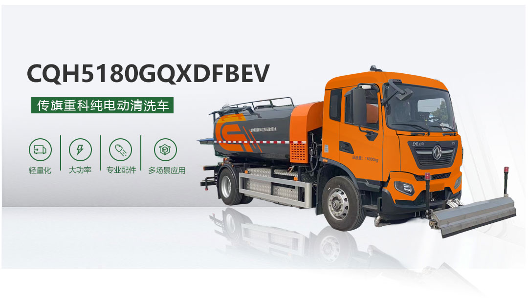 “传旗重科牌” CQH5180GQXDFBEV纯电动清洗车采用DFH1180BEV1纯电动底盘改装,整车适用于城市道路、广场、机场、港口码头、公路等的清洗作业和喷雾降尘的多功能清洗车。具有独立的高、低压两套水路系统,工作装置采用模块化设计,可选配多种清洗作业功能和辅助作业功能,喷水架能清洗路面陈旧污渍,高压喷枪可清洗路标、广告牌等;喷雾系统具有强大的喷雾降尘及调节空气湿度功能。