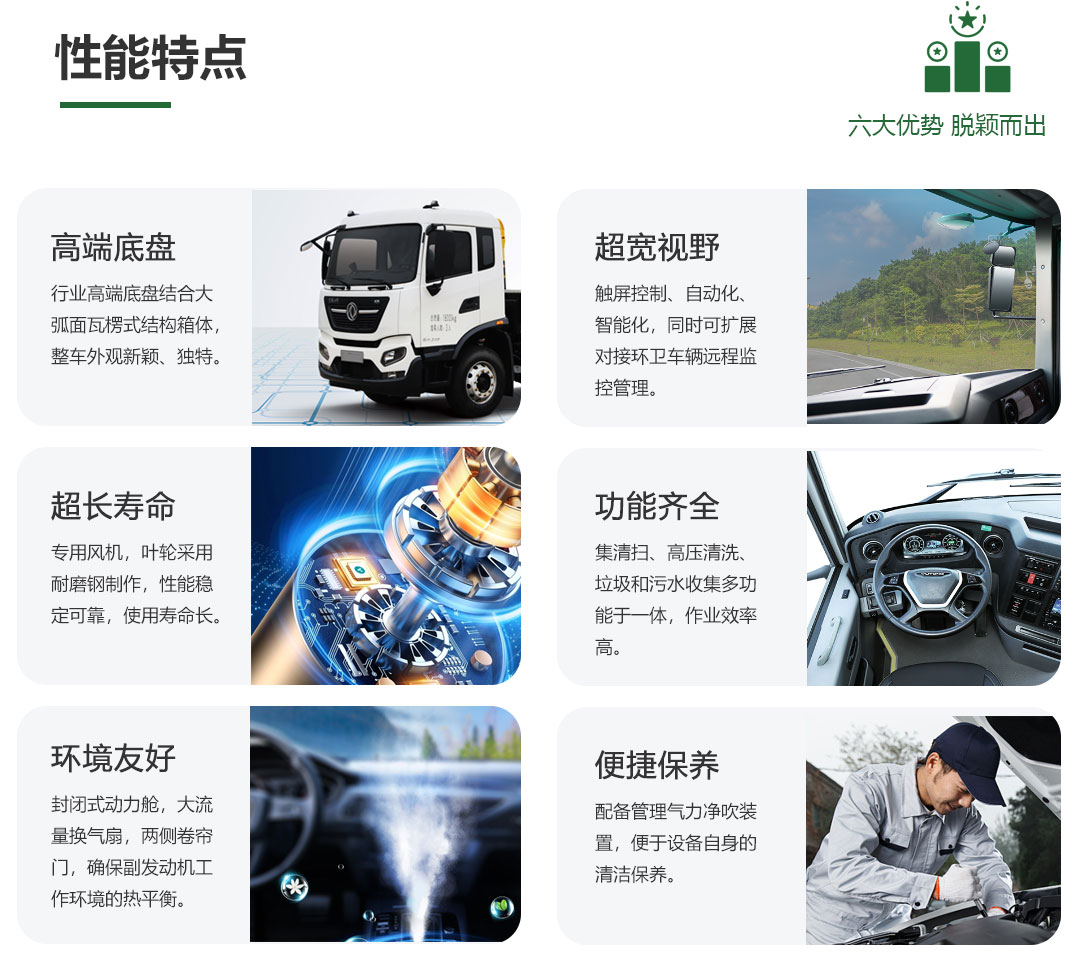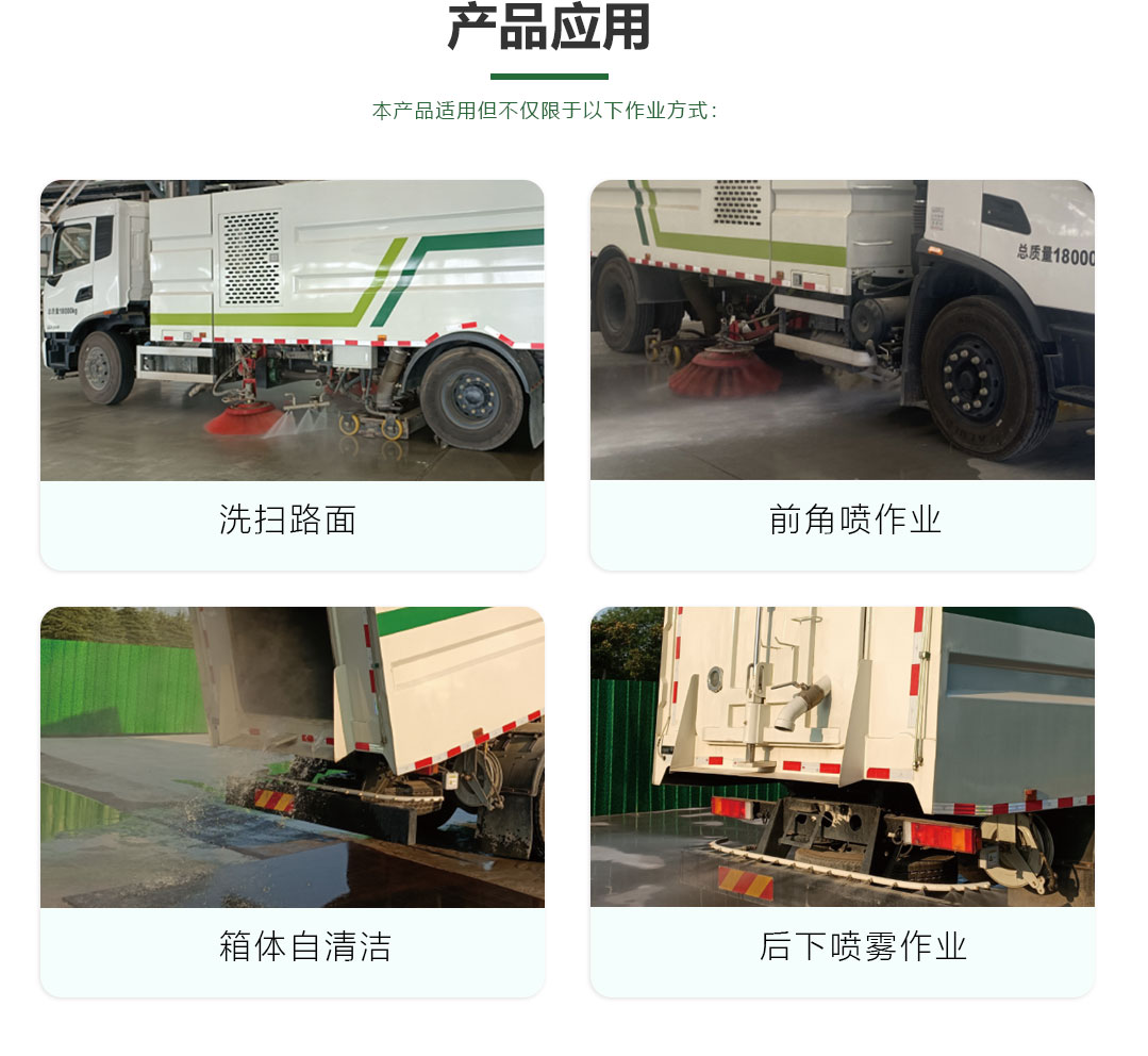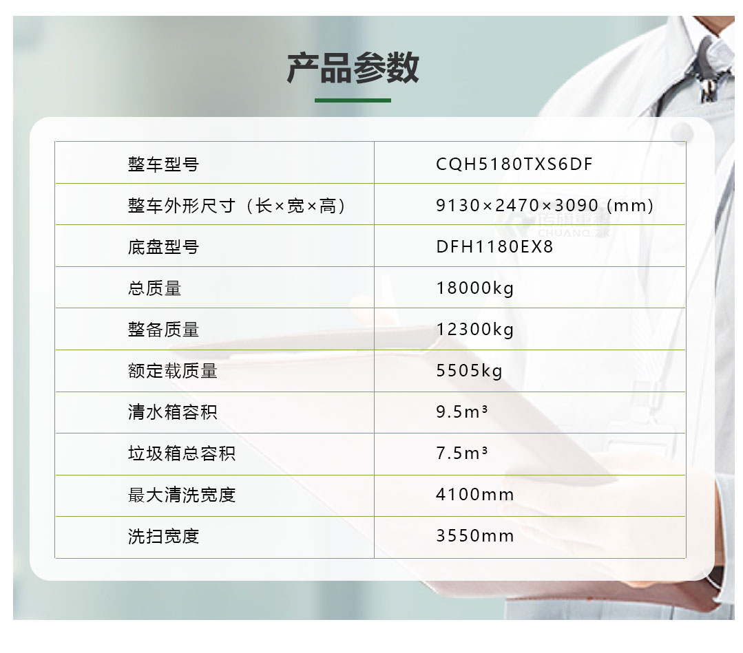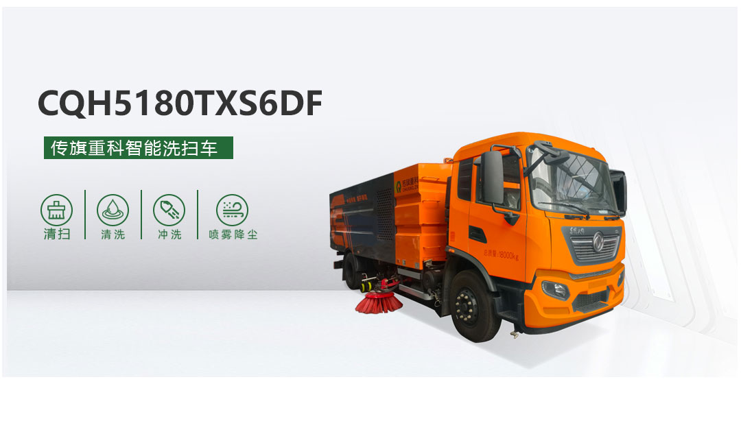 “传旗重科牌”CQH5180TXS6DF洗扫车整车采用东风天锦DFH1180EX8型国六二类汽车底盘改装,由副发动机、风机、高压水泵、清水箱、垃圾箱、左右立扫、带喷水杆的宽吸嘴、低压冲洗系统、扫盘降尘系统、液压系统、专用装置电控系统和副车架等改装而成。适用于城市城市道路、高速公路、广场、机场、码头、隧道、桥梁、隔离墙壁、路缘及路缘石立面的机械化清洗、清扫、喷雾降尘等清洁作业。