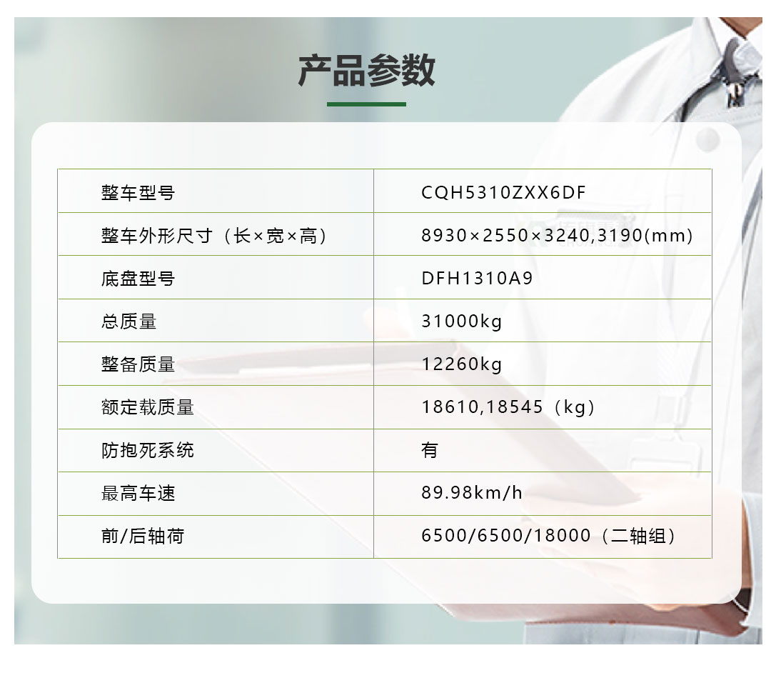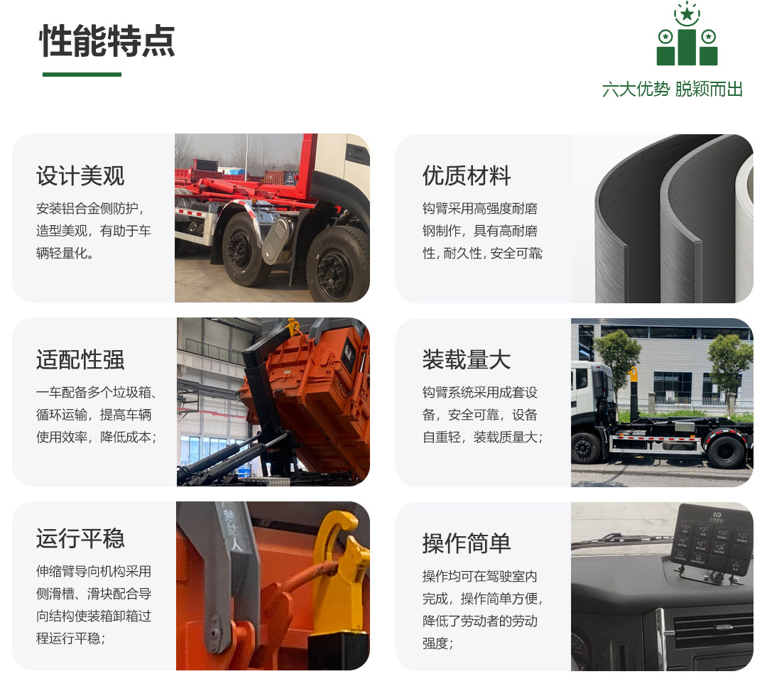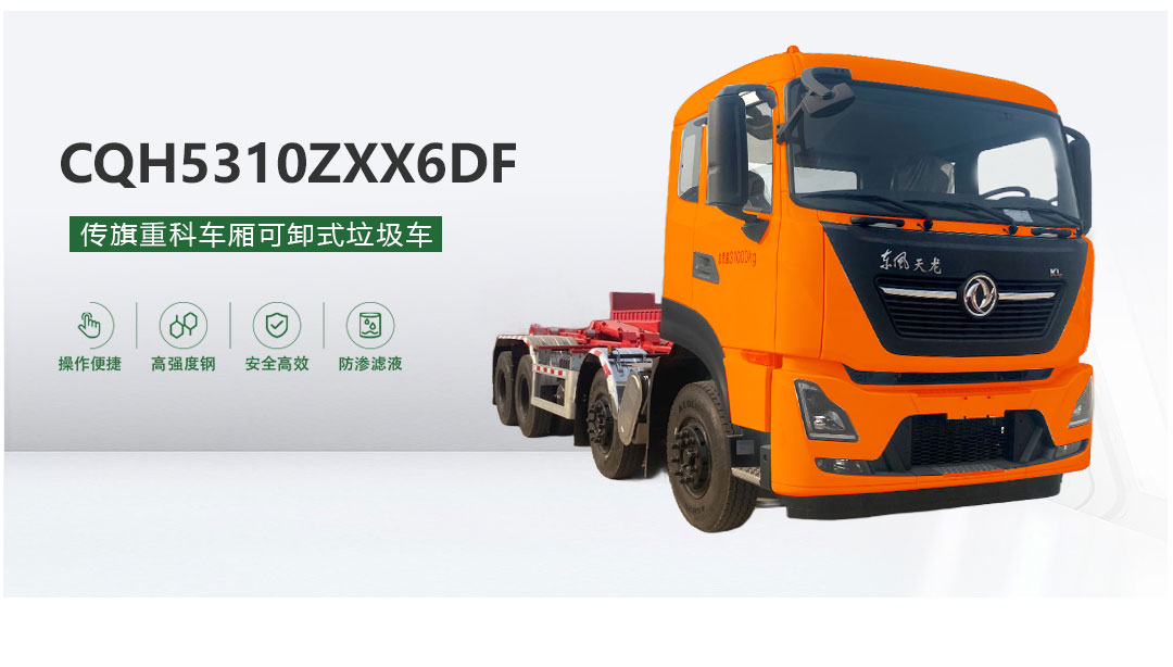 “传旗重科牌” CQH5310ZXX6DF车厢可卸式垃圾车及配套的垃圾压缩站是我公司自主研发的一种新型垃圾转运车辆,具有垃圾收集、垃圾压缩、垃圾转运、垃圾卸料等多种功能,适用于城镇袋装或散装垃圾的收集及转运,一车多用,满足垃圾转运的不同需求。