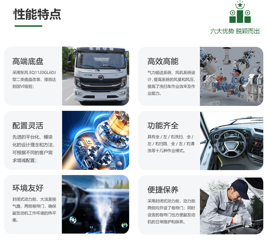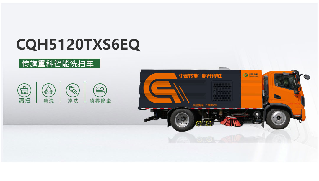 “传旗重科牌”CQH5120TXS6EQ洗扫车整车采用东风国六二类汽车底盘改装由副发动机、风机、高压水泵、清水箱、垃圾箱、左右立扫、带喷水杆的宽吸嘴低压冲洗系统、扫盘降尘系统、液压系统、专用装置电控系统和副车架等改装而成。适用于城市城市道路、高速公路、广场、机场、码头、隧道、桥梁、隔离墙壁、路缘及路缘石立面的机械化清洗、清扫、喷雾降尘等清洁作业。